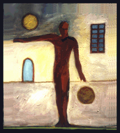 "Michael Juggles The Sun and Moon." -- Oil painting by Shirley Gaines.